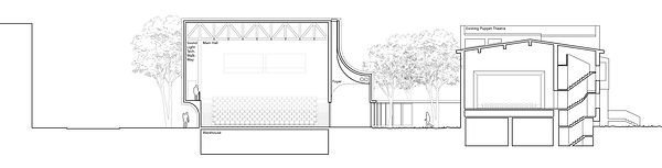 Its placement to the west creates an open space between the old and new and forms a courtyard for open-air performances. Existing trees along the south of the site are moved into this courtyard, providing shade and greenery. A flat concrete roof is wedged between the volumes at a 3m height. This helps to frame the courtyard, provide a cafe volume to enter into, and allows views towards the courtyard trees, sparking curiosity in passers-by.